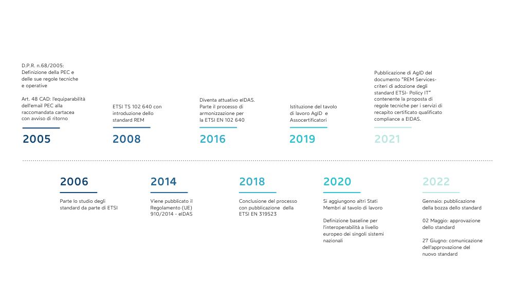 Nel 2021 AgID ha poi redatto e pubblicato il documento “REM Service-criteri di adozione degli standard ETSI-Policy IT” contenente la proposta delle regole tecniche da seguire per i servizi di recapito certificato qualificato in compliance a EIDAS.